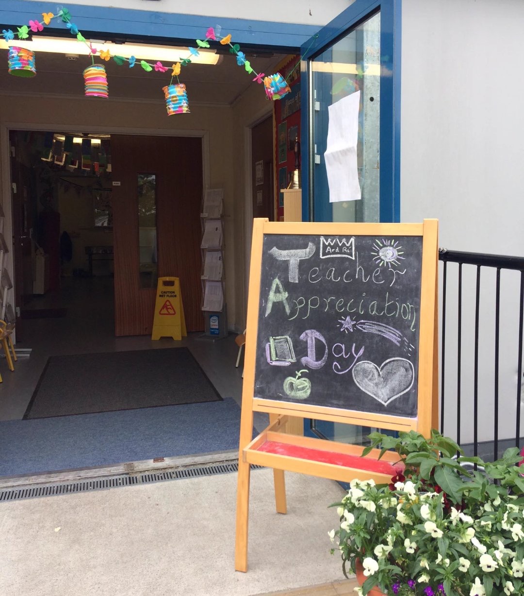 Each child drew a picture or made a card for their teacher and we collected a donation of €2 from each child. This went towards providing our teachers with a small gift. We also provided a very delicious lunch for our teachers courtesy of our talented chefs parents who supplied lots of food and cakes.